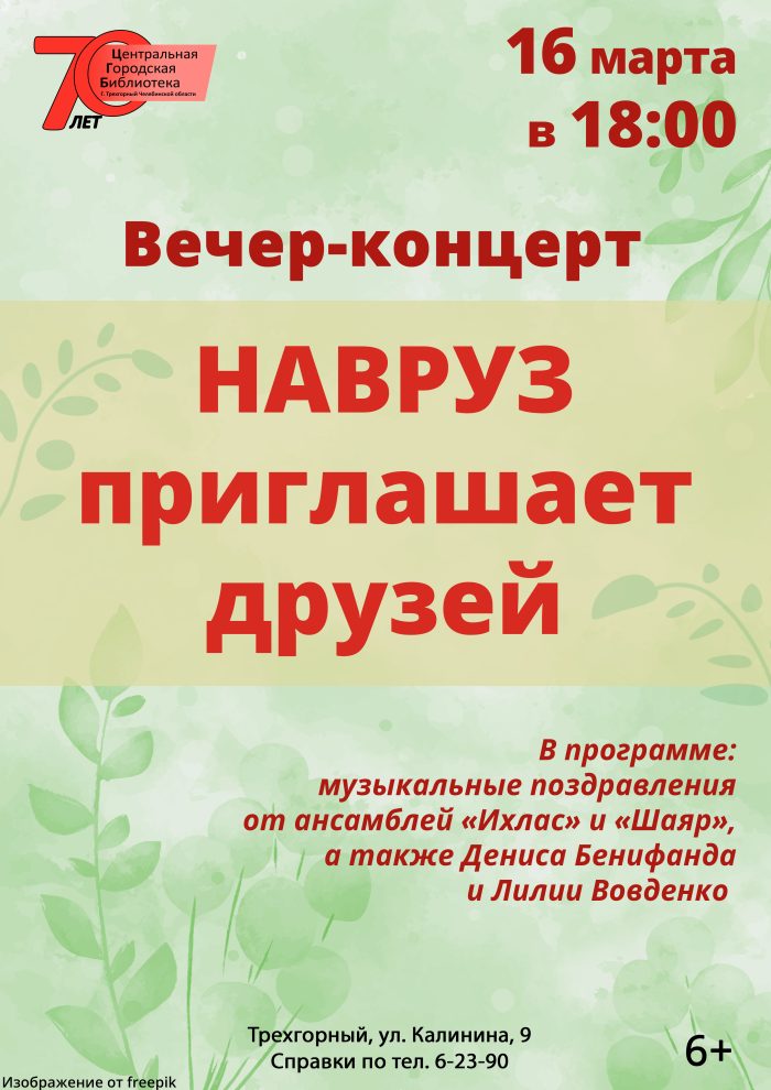 16 марта в 18:00 в библиотеке состоится праздничный вечер-концерт. Для вас будут звучать самые светлые пожелания добра, мира и счастья. Вы окунётесь в атмосферу традиций и культуры нашего многонационального региона и получите возможность услышать лучшие образцы фольклора на татарском, башкирском и русском языках.